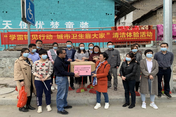河池分公司組織志愿者到金城江街道體育館至維六村委一帶街道進行大清掃。勞動結(jié)束后,分公司向當?shù)丨h(huán)衛(wèi)站捐贈口罩2000個,向環(huán)衛(wèi)一線人員致敬。